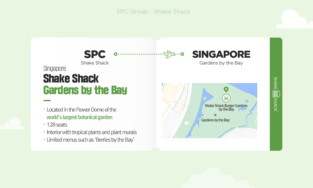 SPC Group was recognized for its operational capacity for Shake Shack in Korea, and has thus been operating the Shake Shack business in Singapore in 2019. It recently opened Shake Shack Gardens by the Bay in front of the Flower Dome at Gardens by the Bay, which is the world’s largest botanical garden and one of the top tourist attractions of Singapore. This new market with a total floor space of 423㎡ and 128 seats is the seventh Shake Shack store opened in Singapore by SPC Group. As it is located at a must-visit tourist course of Marina Bay in Singapore, it is expected that there will be a heavy influx of customers.