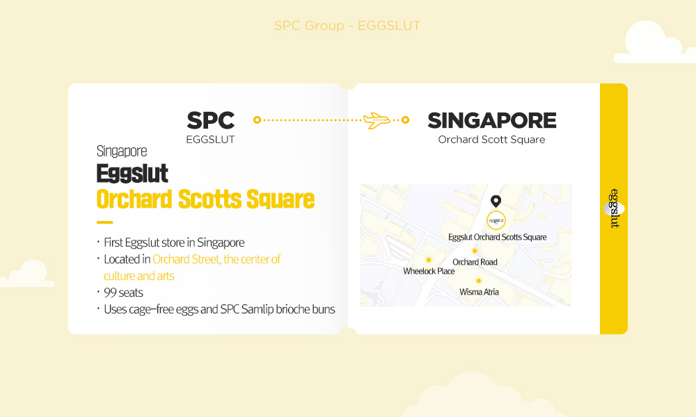 We will now head to Singapore. SPC Group opened the Eggslut Orchard Scotts Square branch in Singapore this month. This is the first Eggslut store to open in Singapore since buying the business and franchise rights for Eggslut in Singapore, an egg sandwich franchise based in LA of the United States. The first Eggslut store in Singapore is located on the first floor of the large shopping mall ‘Scotts Square’ in the busy Orchard area that is also the center of culture and arts with a total floor space of 265㎡ and 99 seats. The interior was designed with the neon sign logo that is emblematic of Eggslut and an open kitchen to bring the feel of LA right to Singapore. Inside the store, customers can enjoy the urban scenery of Orchard Road through the glass wall.