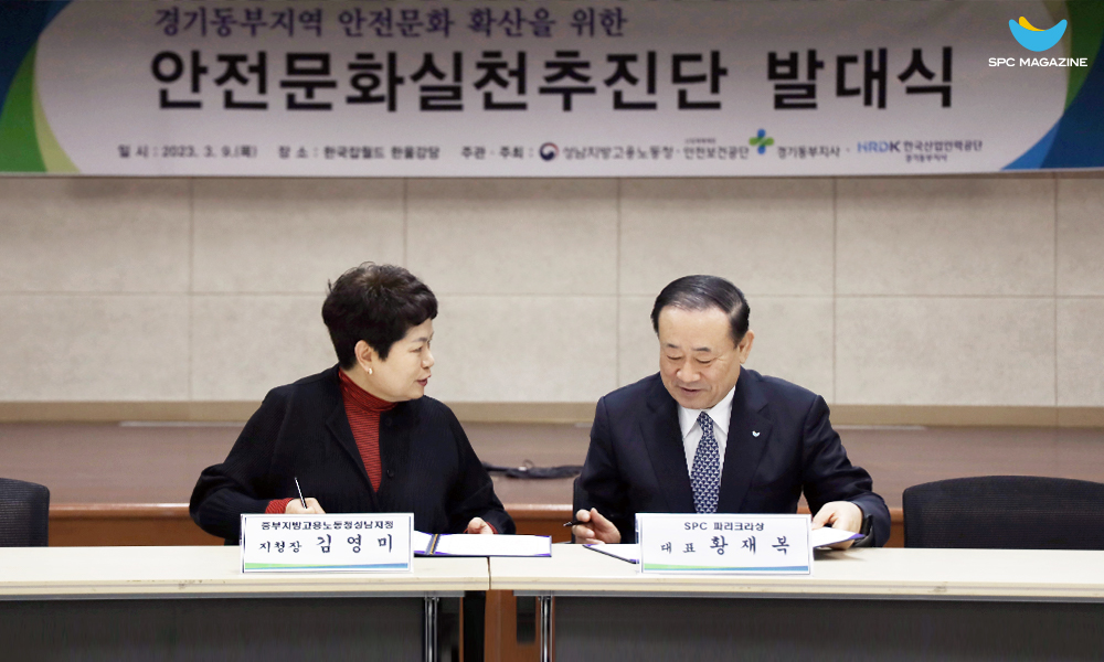 SPC가 고용노동부 중부지방고용노동청 성남지청과 ‘안전문화 확산 캠페인’ 전개를 위한 업무협약을 체결했습니다. 이번 협약을 통해 SPC는 산업 현장에서의 재해예방, 지역사회 안전의식 내재화 등 경기동부지역 안전문화 확산을 위해 고용노동부 성남지청과 공동 협력할 예정인데요. 사업자와 근로자는 물론, 지역 사회에서 시민들이 실천할 수 있는 다양한 안전 활동에 대해 알리고, 안전의식을 고취시키는 디딤돌 역할을 해나갈 것입니다.