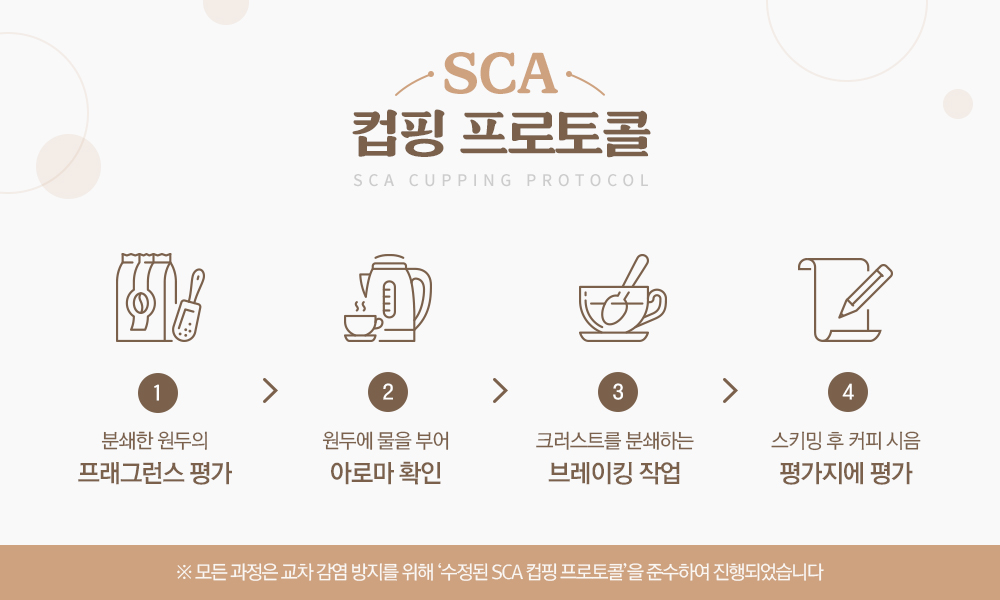 아울러 SPC그룹 커피개발실 연구진은 원두의 품질을 테스트하고 발효 커피가 실제로 출시될 브랜드와 어울리는지를 정확히 평가하기 위해 스페셜티 커피 협회(SCA)가 세운 ‘수정된 SCA 커핑 프로토콜(Modified SCA Cupping Protocol)’에 따라 진행했습니다. 이 커핑(cupping, 커피의 향과 맛의 특성을 평가하는 행동) 절차는 기존 ‘SCA 커핑 프로토콜(SCA Cupping Protocol)’ 과정 중 교차오염을 통한 감염을 예방하기 위해 고안된 과정인데요. 참가자에게 개인 스푼과 컵을 제공하고 도구를 입술 등에 직접적으로 접촉하는 행위를 금하며 슬러핑(slurping, 후루룩 소리를 내어 커피를 입에 분사시키는 과정)을 삭제하는 등의 내용이 추가되었습니다.(2020년 3월 개정)