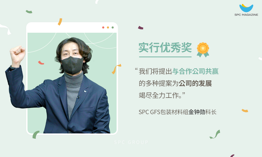 大家好。我是获得提案实行优秀奖的SPC GFS包装材料组的金钟勋科长。我觉得在现场的同事们比起我更应该获奖,所以感觉有些受之有愧。作为SPC采购负责人,我思考着在系统内与合作公司共赢的配置优化方法,一边积极地参与了提案。非常感谢给予我这样的奖项。今后也会在我所在的职位上为公司的发展竭尽全力地工作。