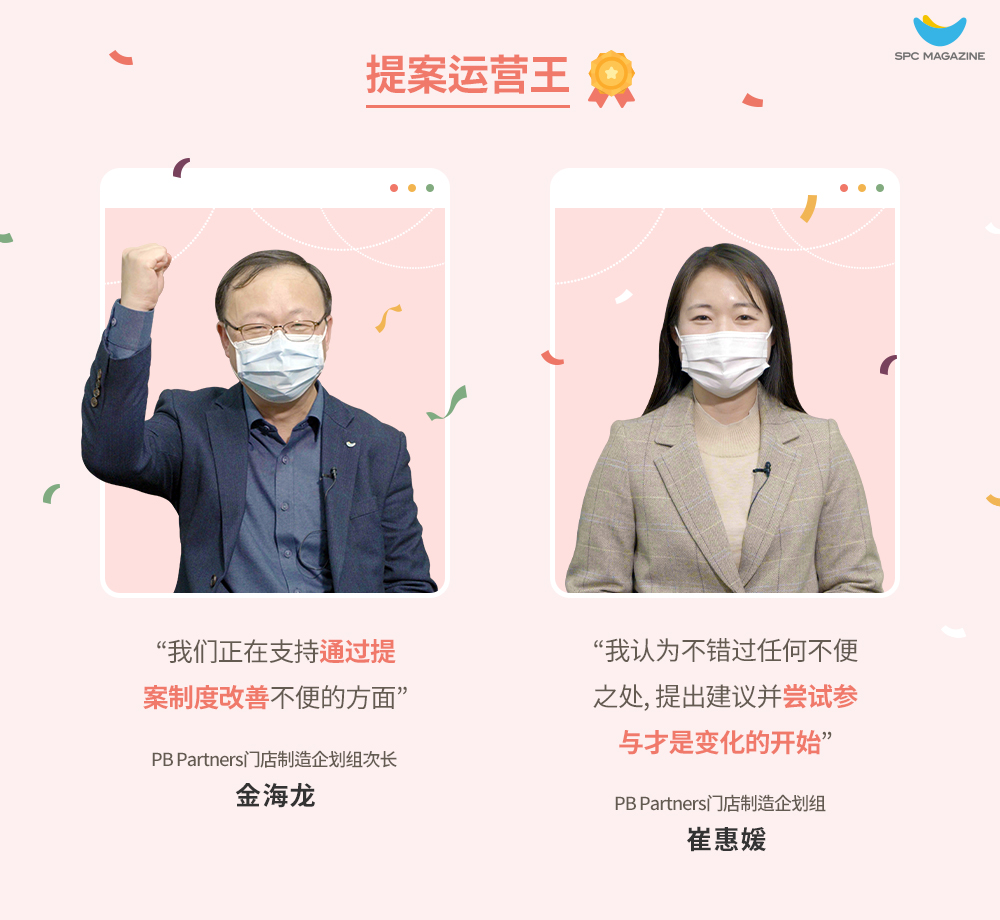 SPC GFS包装材料组金钟勋科长所提出的创意中有3个被选定为主要提案优秀实行事例,获得了实行部门优秀奖。PB Partners提案事务局门店制造企划组的3846名员工共提出了2万5799件提案,获得了运营部门大奖的荣誉。那么,让我们来听一听闪耀2021年表现活跃的提案王们的故事吧!