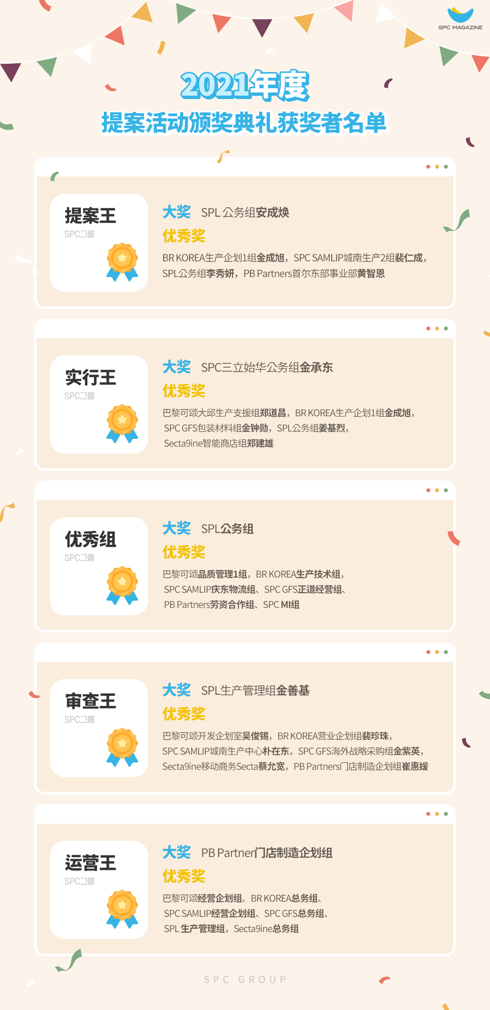 SPC集团通过积极收集员工们新创意的“提案制度”,在产品、服务、业务、品质、公司内部文化等多个领域实现了革新。特别是去年比前年相比,更多的员工们参加了提案活动,对公司的成长起到了很大的帮助。SPC集团于本月14日举行了“2021年提案王颁奖典礼”,并选出优秀的提案活动参与者并给予奖励。今天让我们回顾一下过去一年的提案活动成果,并见一见被选为优秀提案参与者的光荣的主人公们吧。