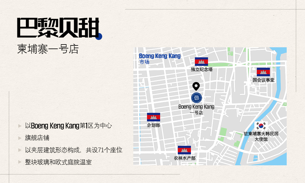 此次开业的巴黎贝甜柬埔寨一号店Boeng Keng Kang店位于柬埔寨首都金边(Phnom Penh)。这里在象征柬埔寨现代史的独立纪念塔(Independence Monument)附近,也因在柬埔寨进行开发援助活动的大多NGO位于这里而被称为NGOville的中心地。尤其是,巴黎贝甜Boeng Keng Kang店所处的Boeng Keng Kang第一区是柬埔寨最大的商业区和旅游区,是本地人和游客来往最多的地区。