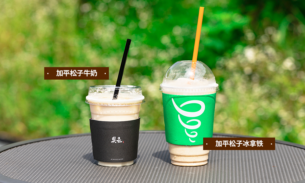 Bizeun年糕的“加平松子牛奶”和Jamba Juice的“加平松子拿铁”