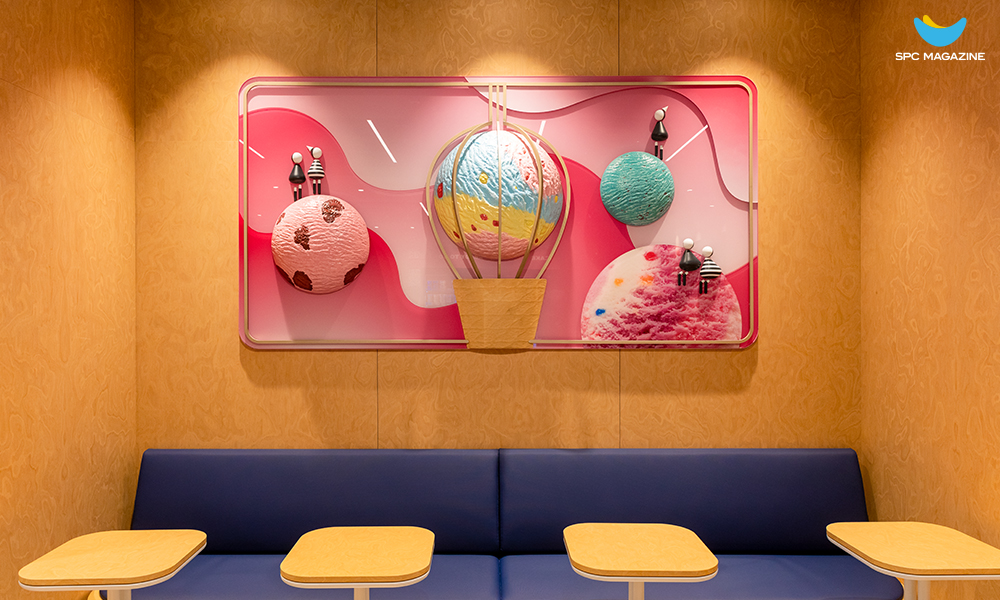 吸引着顾客视线的墙面艺术是设计中心企划的空间品牌的作品之一,创意性地诠释了冰淇淋的概念。在门店一角摆放着各种派对用品和芭斯罗缤周边产品的陈列台。