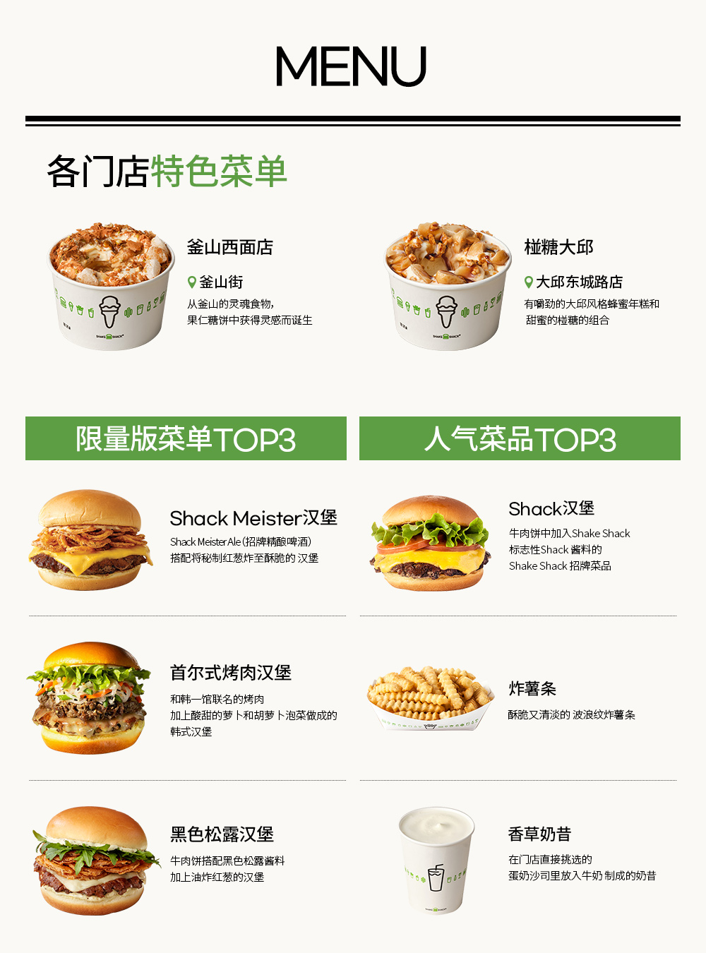 Shake Shack中也有每个季度限定的时间才能品尝到的菜品。虽然纽约开发的美国风格菜品也在韩国亮相,但像“辣椒酱Shack”一样,从韩国料理中获得灵感的菜品也在美国、英国、菲律宾等海外市场销售。到目前为止,在韩国上市的限量版菜品中,“Shack Meister汉堡”、“首尔式烤肉汉堡”、“黑色松露汉堡”备受顾客们的喜爱。除此之外,Shake Shack还有多种菜品,充满着挑选着吃的乐趣。在牛肉饼中加入Shake Shack独有的特制酱料的“Shack汉堡”和酥脆清淡的波浪纹“炸薯条”,在蛋奶沙司中用牛奶代替冰块而制成的味道浓郁的“香草奶昔”等丰富多彩的菜单组合,吸引着“Shack-Fan”。通过优质的原料、特殊的配方、根据季节变换的季节菜单等,顾客每次在Shake Shack都会感受到全新的体验。