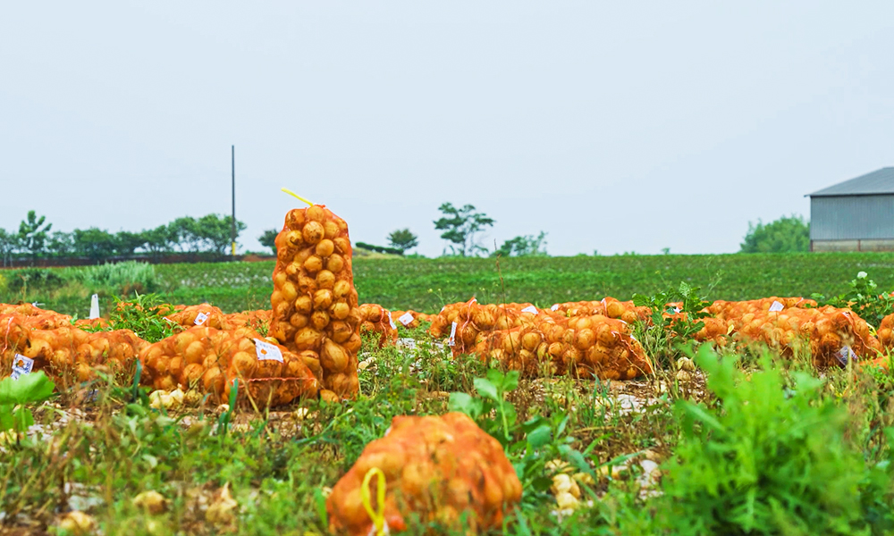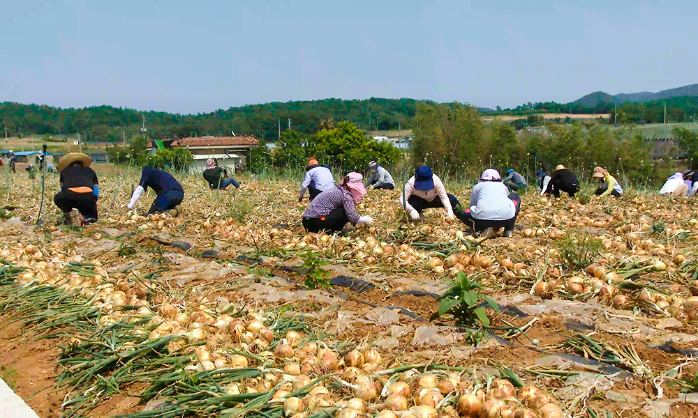 在韩国最好的洋葱产地—全罗南道务安郡收获洋葱的样子