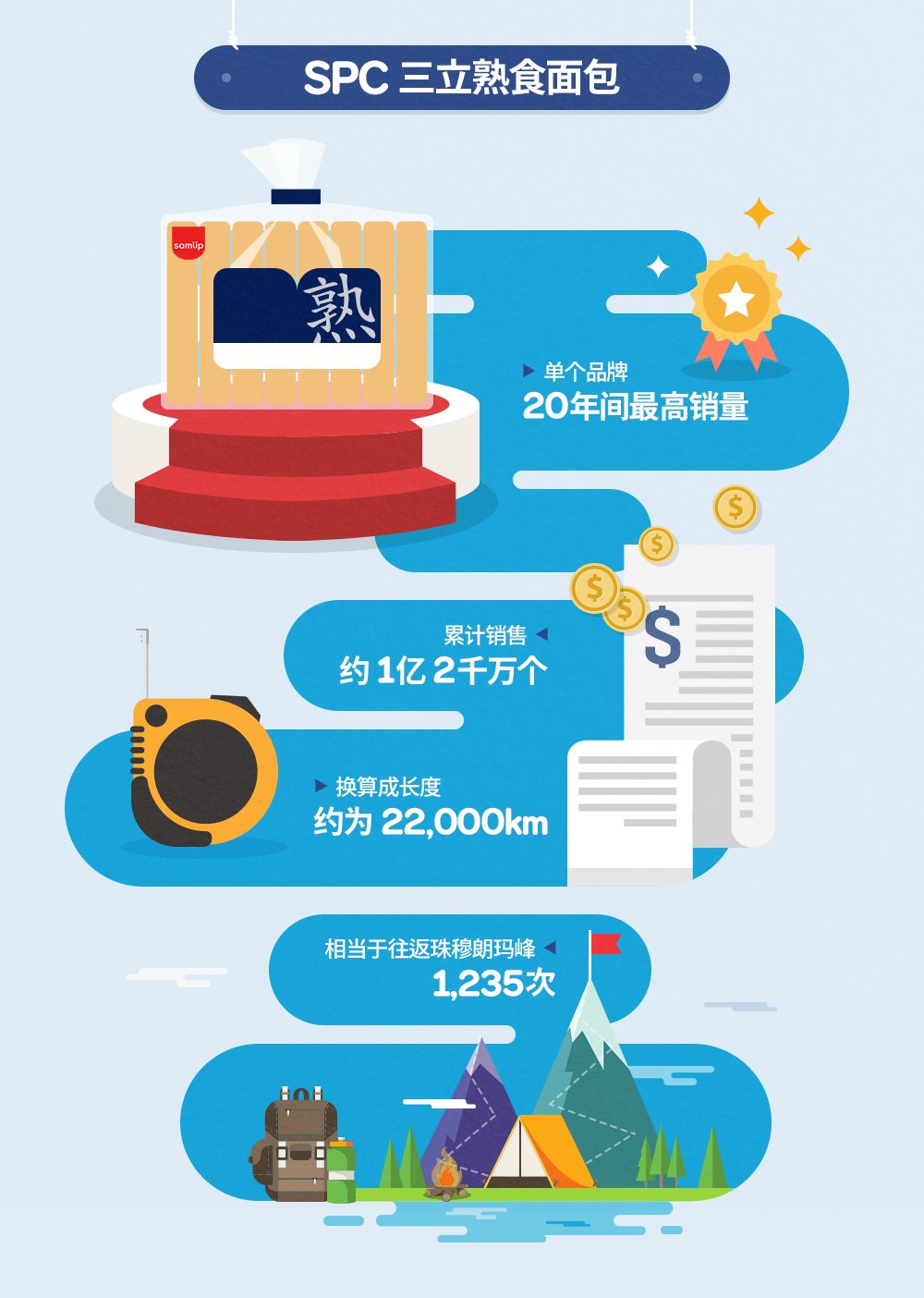 SPC三立的“56小时低温熟成,柔软的熟食面包”是到今年上市了20年的长寿面包。不仅长时间在低温中发酵,还使用了用热水制作烫面的“烫种技法”,其特点是既湿润又劲道的口感。另外“熟食面包”在上市后的20年间累计销量约1亿2千万个,是作为单一品牌销售量最多的产品。如果将“熟食面包”的销售记录换算成长度,约22000千米,相当于往返高达8848米的珠穆朗玛峰1,235次。SPC三立计划将以通过韩国记录院(KRI)正式认证积累的面包秘诀和技术力为基础,留下长久以来给消费者带来幸福体验的“熟食面包”的历史。