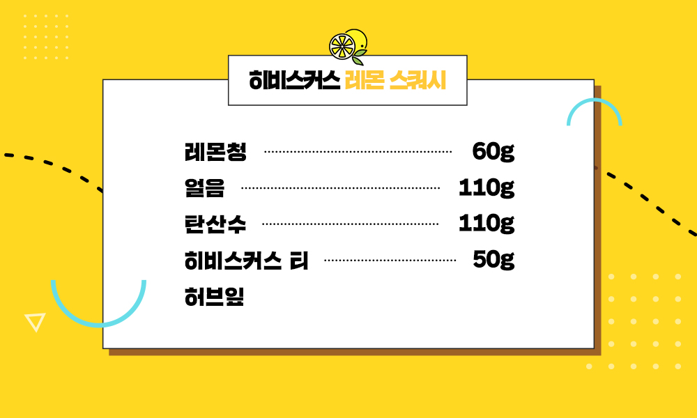 레몬청 60g, 얼음 110g, 탄산수 110g, 히비스커스 티 50g, 허브잎