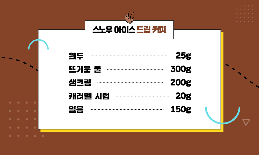 커피 원두 25g, 뜨거운 물 300g, 생크림 200g, 캐러멜 시럽 20g, 얼음 150g