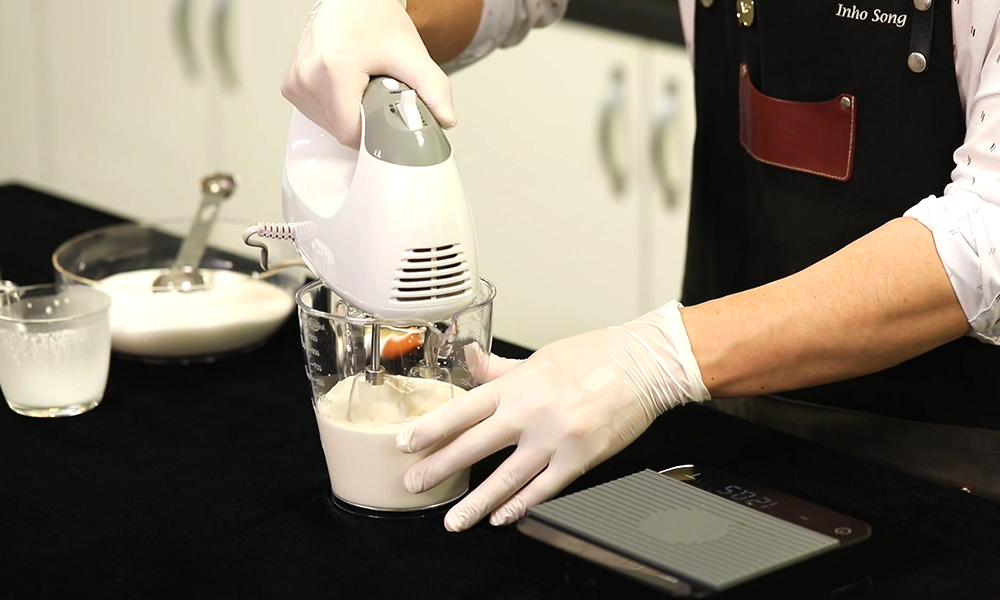 1. 빈 믹싱 용기에 생크림, 캐러멜 시럽, 설탕을 넣고 10분간 휘핑합니다.