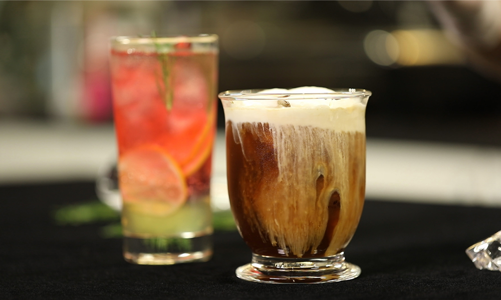 히비스커스 레몬 스쿼시(왼쪽)와 스노우 드립 아이스 커피(오른쪽)