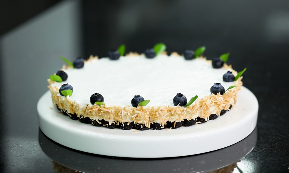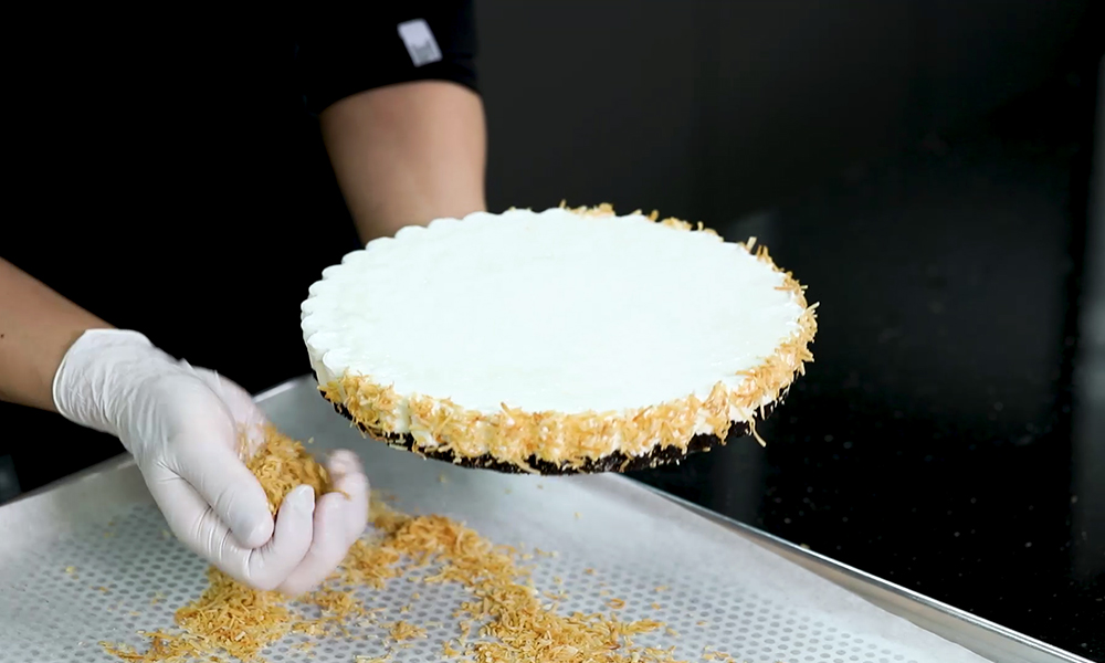 4. 틀에서 분리한 치즈케이크에 구운 코코넛 가루를 붙여줍니다. (시중에서 구매 가능한 코코넛 가루를 가볍게 구워주시면 됩니다!)