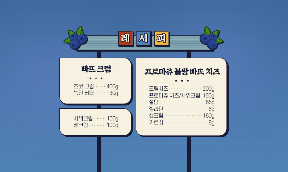 크림치즈 200g, 프로마쥬 치즈 160g, 샤워 크림 160g, 설탕 65g, 젤라틴 6g, 생크림 160g, 키르쉬(kirsch, 제빵용 체리술) 8g