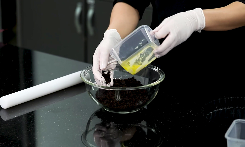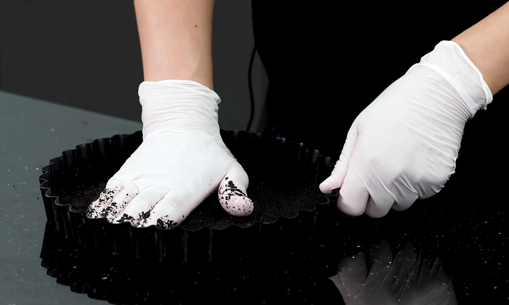 3. 케이크 틀에 빠뜨 크럼을 깔아준 다음 단단하게 굳을 수 있도록 잘 눌러 냉동실에서 30분간 굳힙니다.