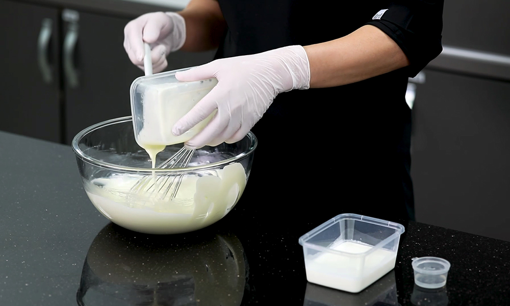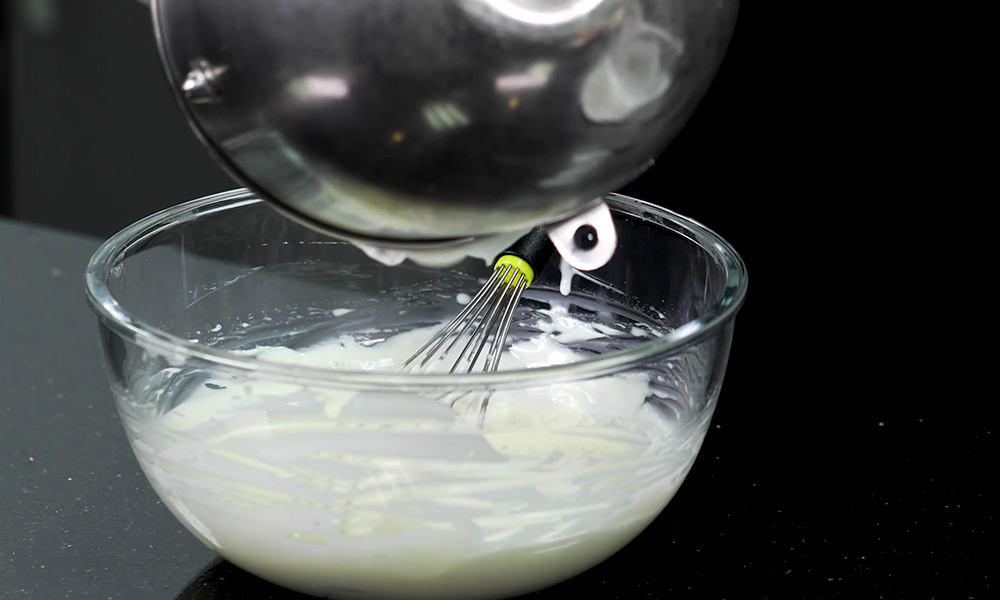 3. 전자레인지에 1분 정도 돌려 녹인 젤라틴을 본 반죽에 넣어 섞어줍니다. 이때, 젤라틴이 굳지 않도록 빠른 속도로 섞어주세요.