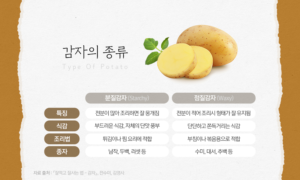 감자는 주요성분인 전분 함량의 차이에 따라 성질이 다릅니다. 이 때문에 조리하는 방법에도 차이가 나는데요. 보다 맛있는 음식을 만들기 위해서는 이를 잘 구분해야 합니다.