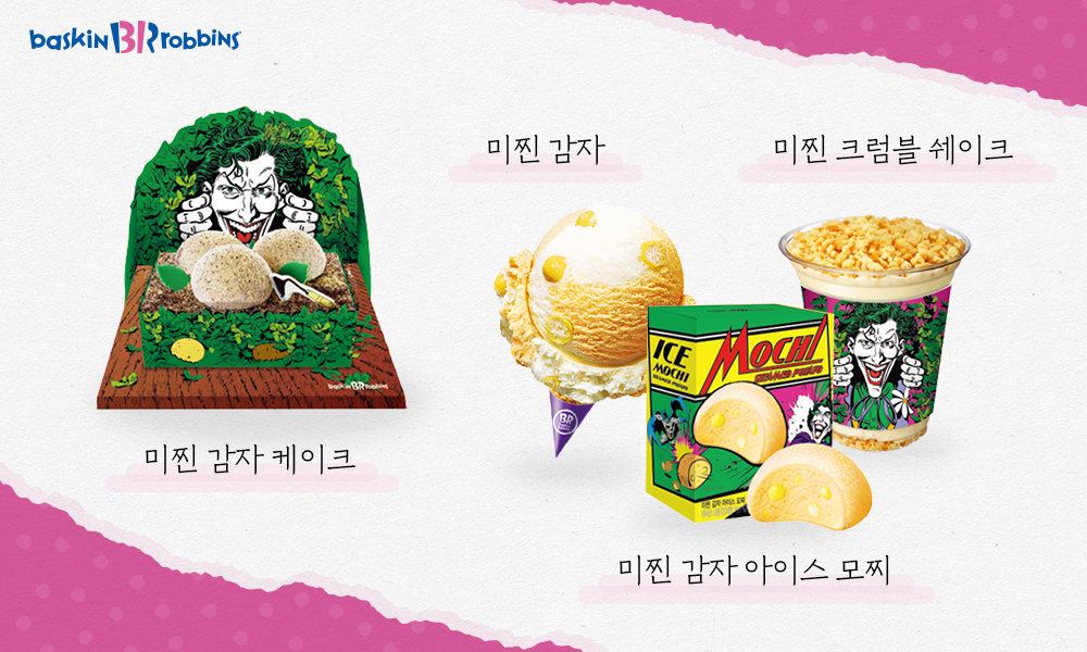 배스킨라빈스는 10월 이달의 맛으로 ‘미찐 감자’를 출시했습니다. ‘농가와의 행복한 상생’과 ‘고품질의 맛’이라는 고객 가치를 높이기 위해 기획된 신제품인데요. 여기에 DC 코믹스와의 협업을 통한 재미 요소를 더해 완성도를 높였습니다. 한자 ‘맛 미(味)’ 자와 ‘찐 감자’를 조합해 제품명을 정하고, DC 코믹스의 캐릭터 ‘조커’를 연상시키는 ‘미치게 맛있는 맛!’이라는 문구를 적용했습니다.