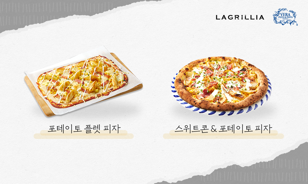 라그릴리아와 베라피자는 우리 농가를 응원하기 위해 강원도 청정지역에서 생산한 감자로 만든 ‘스위트콘&포테이토 피자’를 출시했습니다. 부드러운 감자와 달콤한 옥수수 토핑 위에 갈릭 사워크림을 곁들였습니다. 감자와 치즈는 찰떡궁합을 자랑하는데요. 치즈의 짭짤하고 고소한 맛이 잘 어우러져 둘의 맛이 극대화되고, 서로 부족한 영양소를 보충해주어 영양적으로도 조화를 이루는 제품입니다. 스위트콘 포테이토 피자는 라그릴리아 양재점, 광화문점, SPC 스퀘어점과 베라피자에서 만나볼 수 있습니다. 그리고 라그릴리아 신도림점, 은평점, 공덕점, 가든파이브점, 청담점, 천호점에서는 얇은 도우의 플랫피자 형태로 만나볼 수 있으니 참고해주세요.
