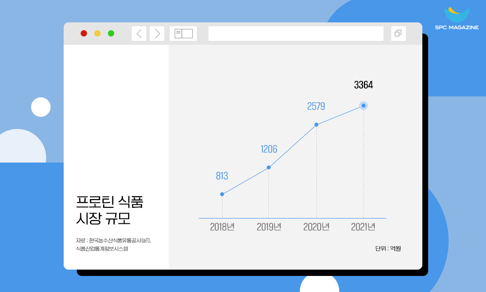 그야말로 프로틴 열풍이라는 말이 딱 들어맞을 정도로, 프로틴 식품 시장의 열기는 매년 뜨겁게 달아오르고 있습니다. 헬스 트렌드가 현대인들의 일상에 깊숙이 자리 잡으면서 식생활에도 커다란 변화가 찾아온 것인데요. 한국농수산식품유통공사(aT) 식품산업통계정보시스템에 따르면, 국내 프로틴 식품 시장 규모는 지난 2018년 813억 원 수준에서 연평균 약 64%의 성장률을 거듭해 2021년 3,364억 원 수준까지 확대됐습니다.