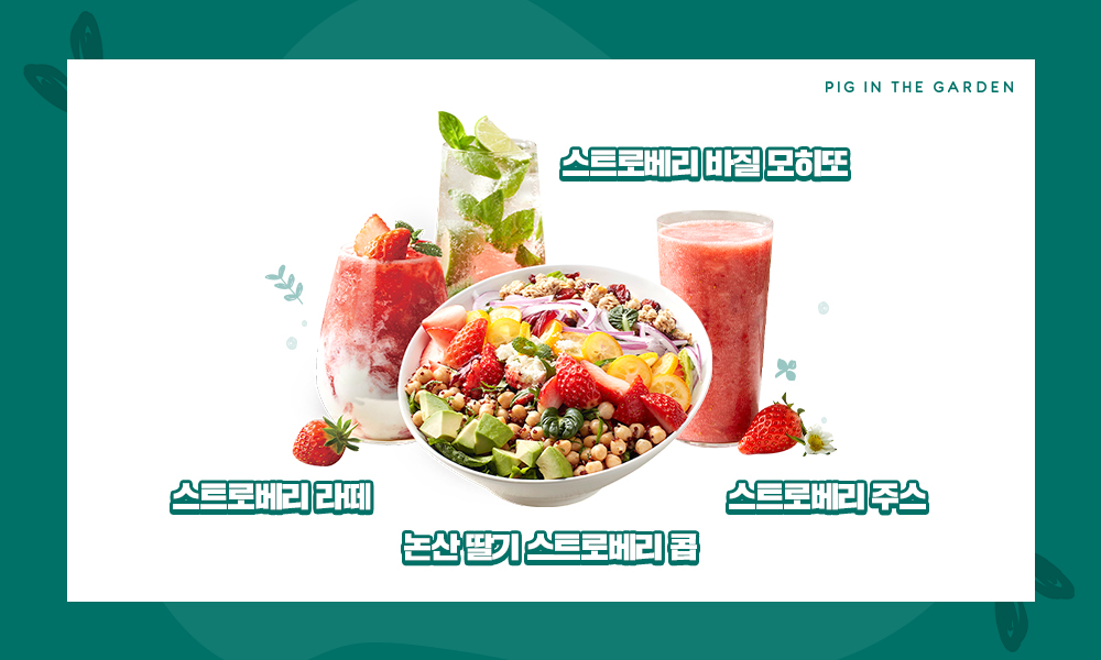 프리미엄 샐러드 전문점 피그인더가든에서도 논산 청정 딸기를 활용한 제품을 출시했습니다. 먼저 ‘논산 딸기 스트로베리 콥’은 달콤한 과즙을 머금은 딸기와 아보카도, 금귤 등 제철을 맞은 식재료를 활용해 다채롭게 완성된 시즌 한정 샐러드입니다. 또한 상큼한 딸기에 바질의 독특한 풍미를 더한 ‘스트로베리 바질 모히또’와 부드러운 우유 달콤한 맛이 어우러지는 ‘스트로베리 라떼’, 논산 딸기의 청정함을 있는 그대로 즐기는 ‘스트로베리 주스’ 등의 음료 3종을 만날 수 있습니다.