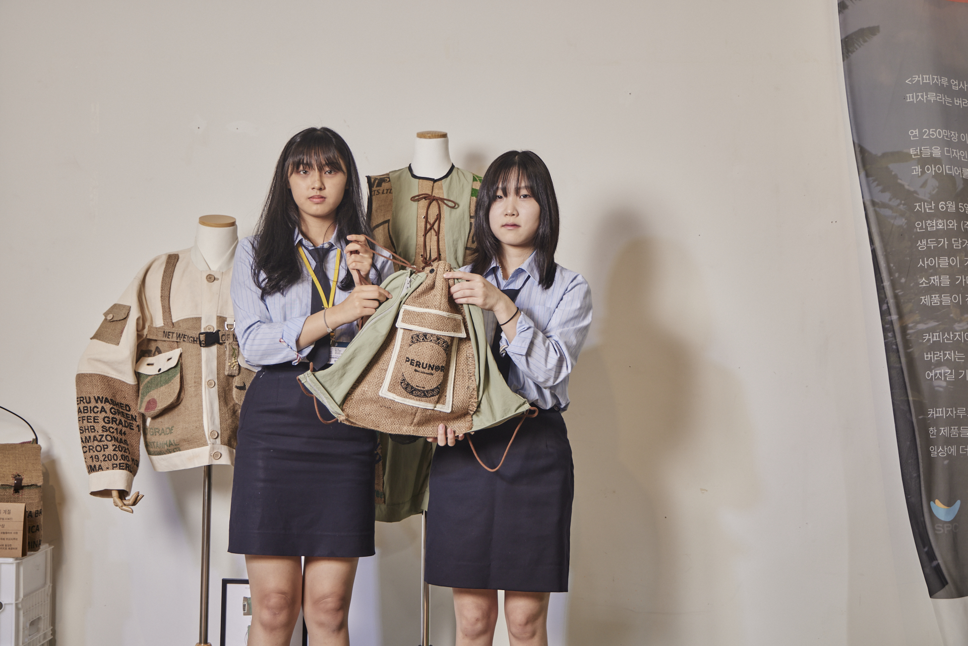 최우수상은 커피자루와 의류 자투리원단을 활용해 한 벌로 4계절 내내 활용할 수 있도록 다양하게 변신이 가능한 바지와 상의를 디자인한 인천생활과학고 양예주, 장아영 학생이 영예를 안았습니다.