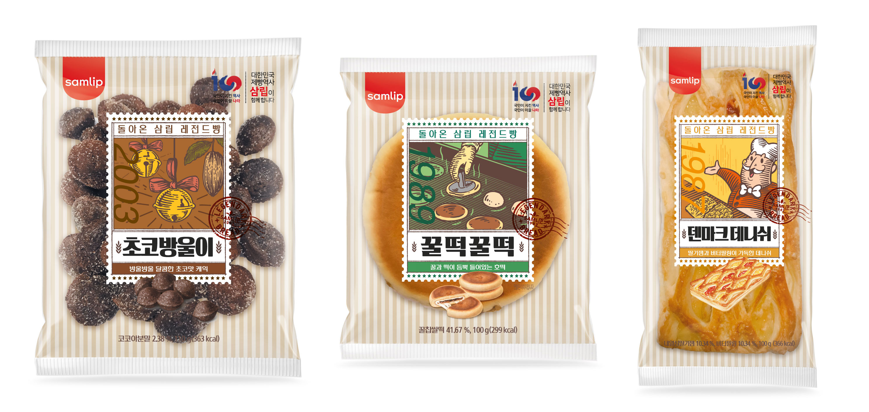 SPC삼립은 ‘우카빵’과 ‘떡방아빵’의 판매 호조에 힘입어 1980년대 및 2000년 초반에 출시되었던 제품 3종을 추가로 새롭게 선보인다. 방울 모양의 미니 초콜릿 케이크에 달콤한 슈가 파우더가 더해진 ‘초코방울이’, 딸기잼, 버터크림, 슈크림을 가득 넣은 패스츄리에 소보로 토핑을 얹은 ‘덴마크데니쉬’, 호떡 속에 꿀크림을 넣은 찹쌀떡이 들어가 쫄깃한 식감이 특징인 ‘꿀떡꿀떡’ 등이다. 전국 편의점, 마트, 슈퍼에서 구매 가능하다.