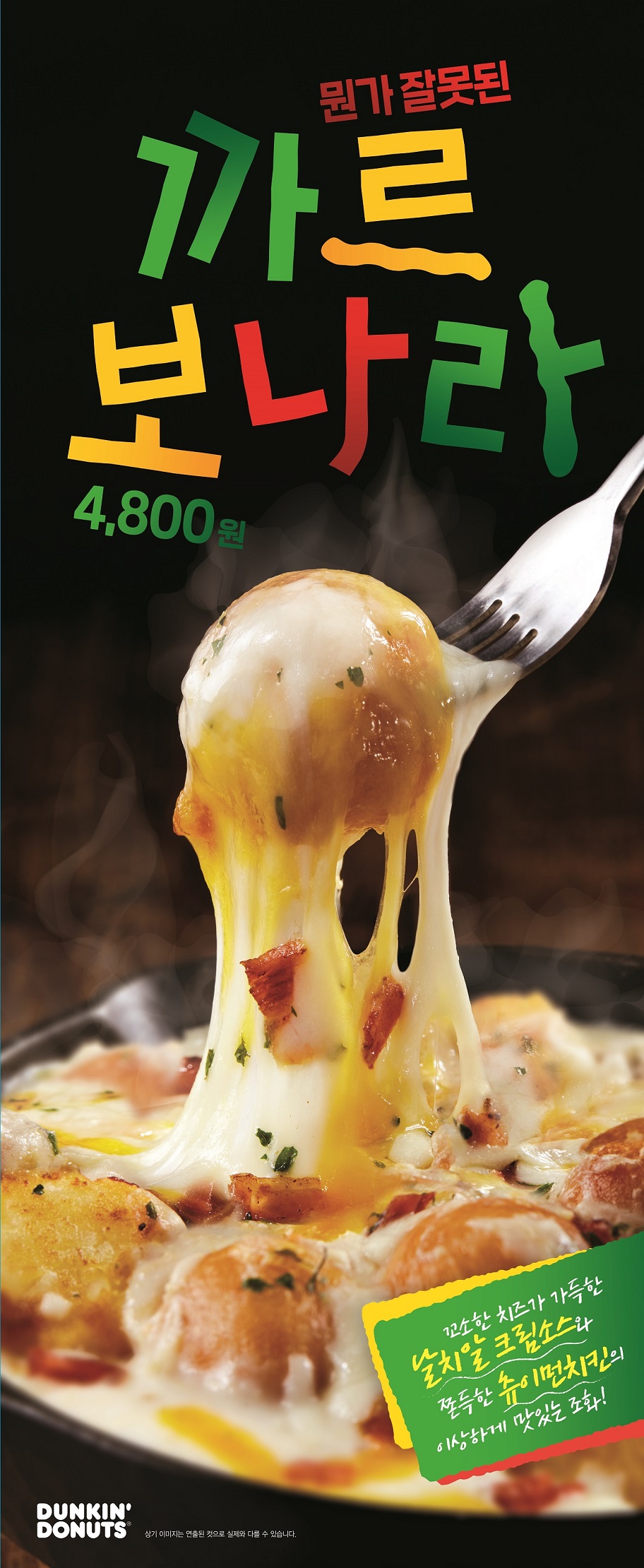 또, 기존 먼치킨 도넛을 활용해 색다르게 탄생한 메뉴 ‘뭔가 잘못된 까르보나라’도 선보였다. 던킨도너츠 도넛 연구소가 개발한 제품으로, 파스타면 대신 츄이먼치킨을 넣어 날치알이 톡톡 터지는 크림소스와 쫀득한 도넛의 만남을 완성했다. 여기에 담백한 치킨 및 베이컨 토핑을 얹고, 해쉬브라운, 모짜렐라 치즈, 체다 슈레드 치즈를 가득 넣어 고소한 맛의 풍미는 물론, 한끼 식사로 간편하게 먹기에 안성맞춤이다. 가격은 4,800원.