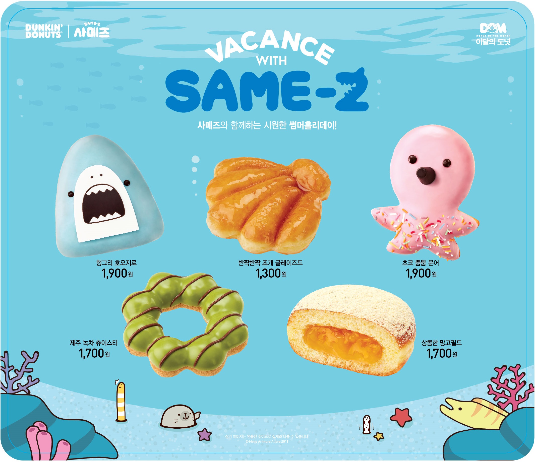 새롭게 출시된 도넛은 ‘사메즈와 함께하는 여름 바캉스’ 콘셉트를 바탕으로, ‘헝그리 호오지로’, ‘초코 뿜뿜 문어’, ‘반짝반짝 조개 글레이즈드’, ‘제주 녹차 츄이스티’, ‘상콤한 망고필드’ 등 도넛 5종이다. 또, ‘망고 코코넛 번 베이글’ 베이커리와 ‘소다 아이스 크러쉬’ 등 아이스 크러쉬 3종도 함께 출시했다.