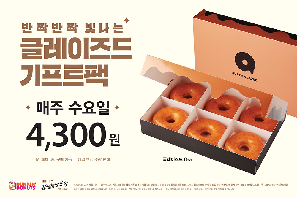 던킨도너츠가 3월 ‘해피수요일’ 프로모션을 실시한다고 밝혔다. 한정수량으로 진행되는 이번 프로모션은 매주 수요일 글레이즈드 6개로 구성된 ‘글레이즈드 기프트 팩’을 4,300원에 판매한다.