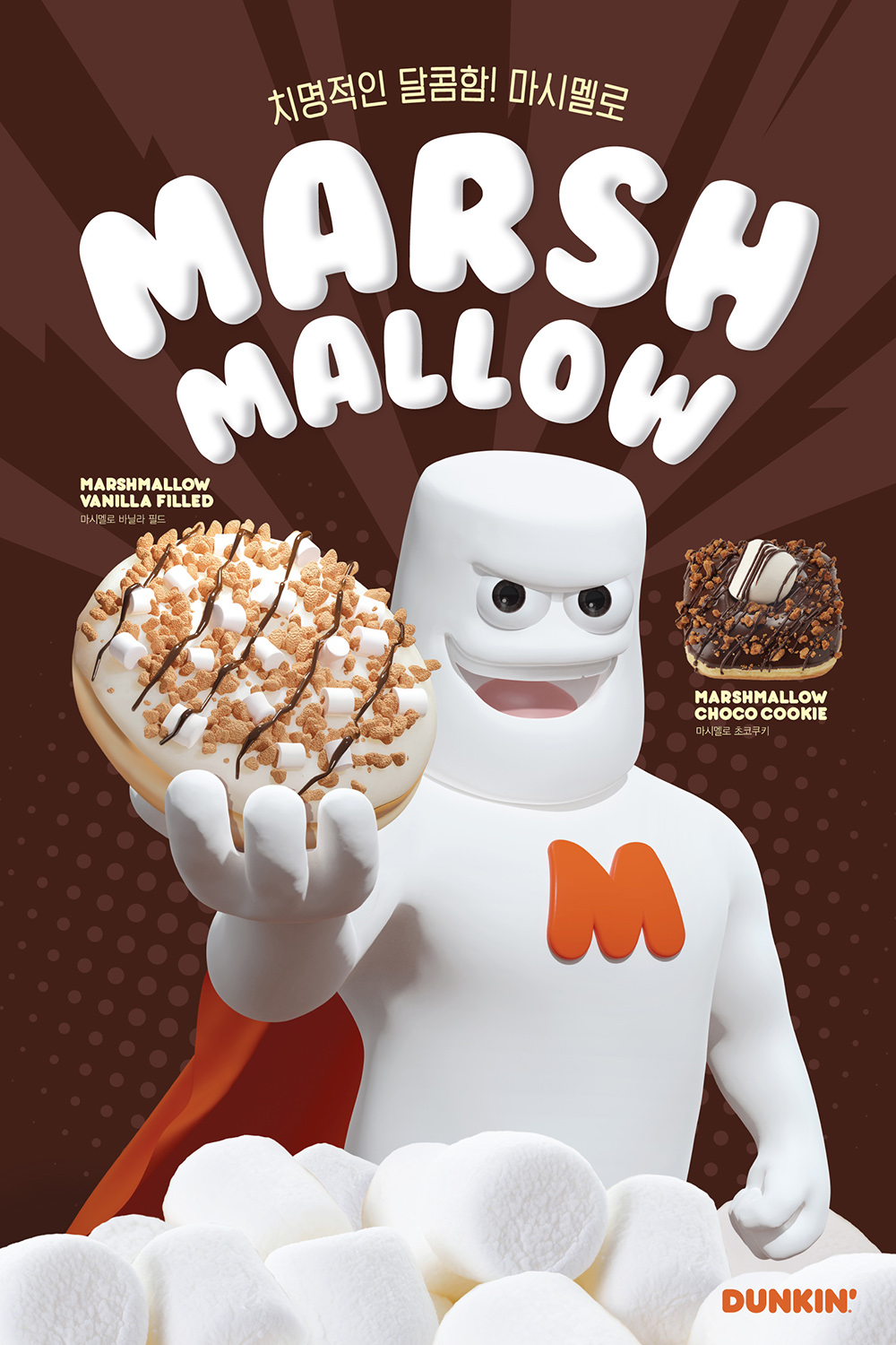 이번 신제품은 다가오는 겨울을 맞이하여 새하얀 눈을 연상케 하는 마시멜로를 원료로 활용하고, 던킨이 만든 캐릭터 ‘마시멜로 맨’을 앞세워 ‘움츠러들기 쉬운 겨울, 달달한 힘을 선사하는 맛’을 주제로 탄생했다.