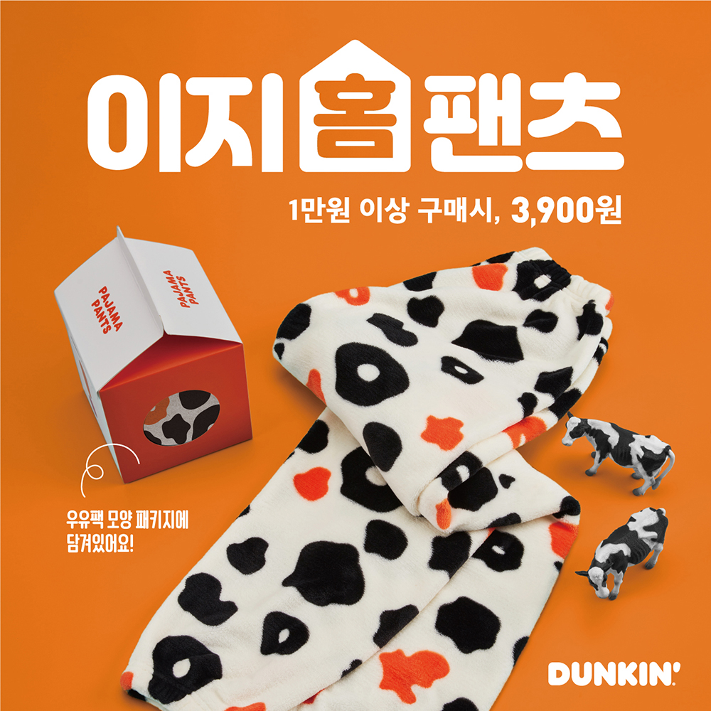 던킨의 ‘이지 홈팬츠’는 집콕 · 재택 문화를 반영한 홈웨어 아이템으로, 2021년을 상징하는 흰 소와 던킨의 1월 메인 원료인 부드러운 우유 콘셉트를 적용했다.