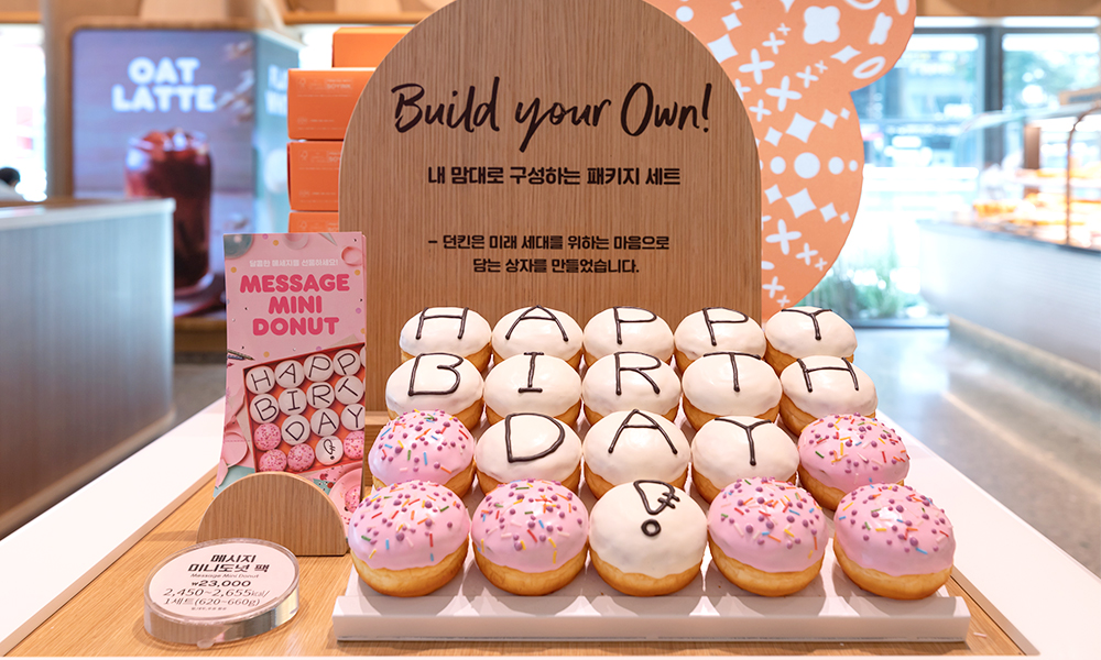특별한 날에는 던킨 라이브의 레터링 도넛 서비스로 센스 있는 선물을 준비해보세요. 해피오더 앱으로 픽업 3일 전에 사전 주문하면 원하는 문구가 새겨진 미니 도넛 세트를 수령할 수 있습니다.