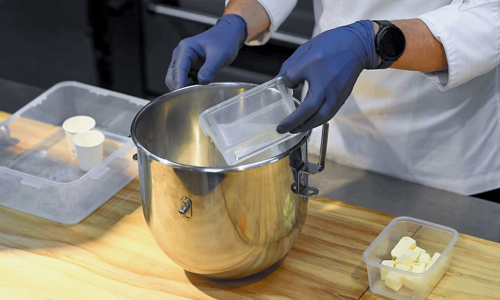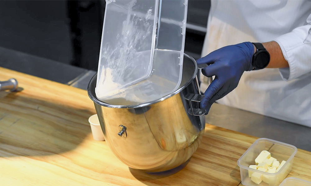 3. 손으로 저어 반죽이 적당히 뭉쳐지면 기계에 걸어서 믹싱을 시작합니다. 1단에서 1분, 2단에서 6분, 3단에서 1분 돌려주세요. 단, 3단 믹싱은 필요에 따라 진행하면 됩니다. 반죽을 정리한 후 다시 2단에서 5분 정도 믹싱해 주세요. 이때 미리 잘라둔 버터 48g을 넣어줍니다. 버터를 넣기 전, 후의 반죽 온도가 높다면 얼음 물로 식혀주세요.