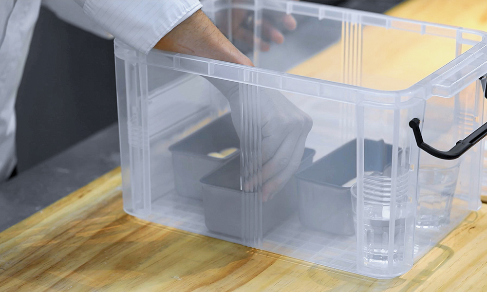 1. 성형이 완료된 반죽을 2차 발효해 주세요. 발효실이 따로 없는 가정집에서는 투명 박스와 뜨거운 물로 간단하게 발효가 가능한데요. 투명 박스 안에 뜨거운 물과 반죽을 담은 틀을 함께 넣어 실온 발효해 주면 됩니다. 빵이 마르지 않도록 뚜껑을 덮어 밀폐시킨 후 온도 34℃, 습도 85% 또는 상온에서 약 60분간, 식빵 팬 밑 1cm까지 발효해 주세요