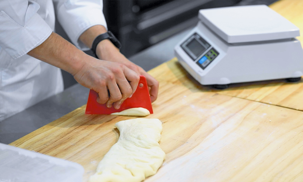 1. 덧가루를 얇게 펼치고 반죽을 손으로 톡톡 두드리며 큰 가스를 제거한 후에 알맞은 크기로 분할해 줍니다. 28g 8개, 48g 4개, 190g 1개의 덩어리로 분할해 주세요.
