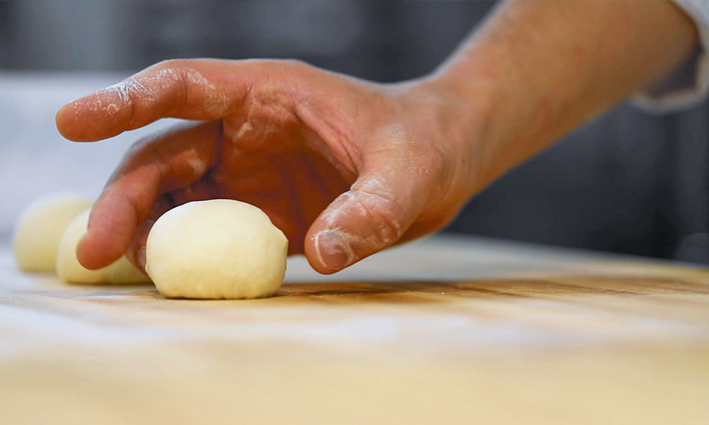 2. 반죽이 찢어지지 않도록 덧가루를 겉면에 코팅해 준 후 분할된 반죽을 둥글리기 해줍니다. 새끼손가락을 이용해 반죽의 양옆과 위, 아래를 돌려가며 정리해 주면 쉬워요. 이어서 둥글리기 한 반죽은 10분간 벤치 타임을 갖습니다.