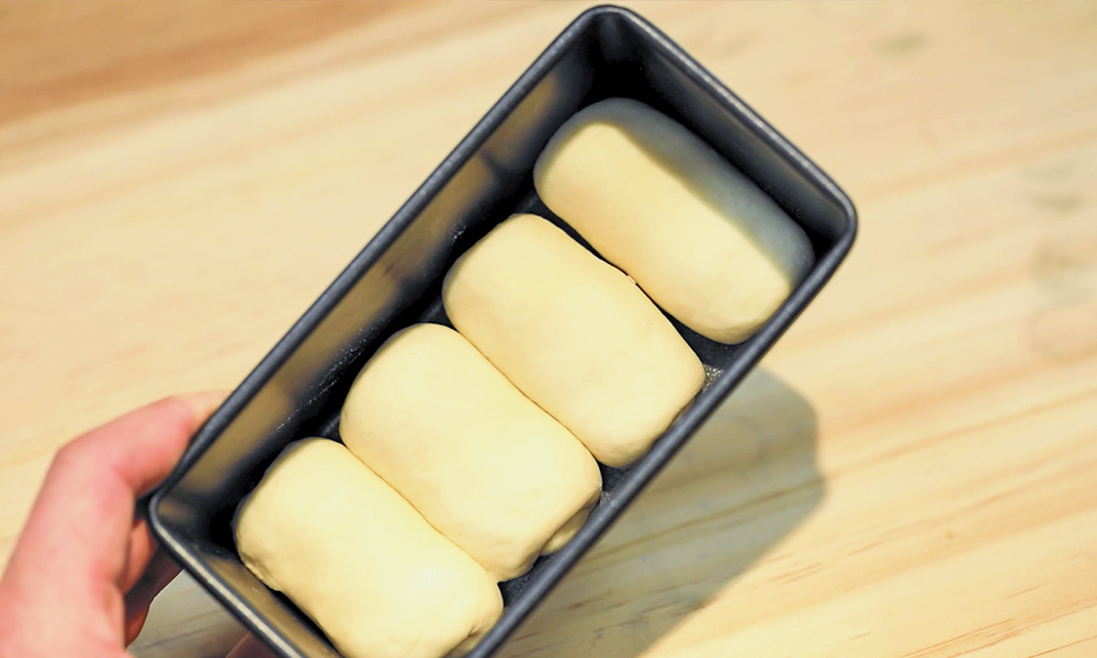 1. 다음 단계는 성형인데요. 식빵을 성형하는 방법 중 대표적인 방법 세 가지를 소개해드리겠습니다. 취향에 맞는 방법으로 따라와 주세요. 첫 번째, 28g의 작은 사이즈 반죽을 다시 한번 둥글리기 한 후 틀 안에 지그재그로 넣어주세요.