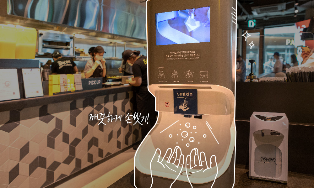 코로나19 예방에 빼놓을 수 없는 또 한 가지는 바로 손씻기입니다. 에그슬럿과 쉐이크쉑 매장에는 스마트 핸드 워싱 시스템인 ‘SMIXIN(Smart-mixing-inside)’을 도입했는데요. 매장을 방문한 고객들은 손 세척 기기 아래 손을 갖다 대기만 하면 자동으로 분사되는 물비누와 깨끗한 물, 종이타월을 차례대로 사용할 수 있습니다. 매장 출입과 매장 이용 도중에 언제나 자유롭게 사용할 수 있어 편리하고 위생적입니다.