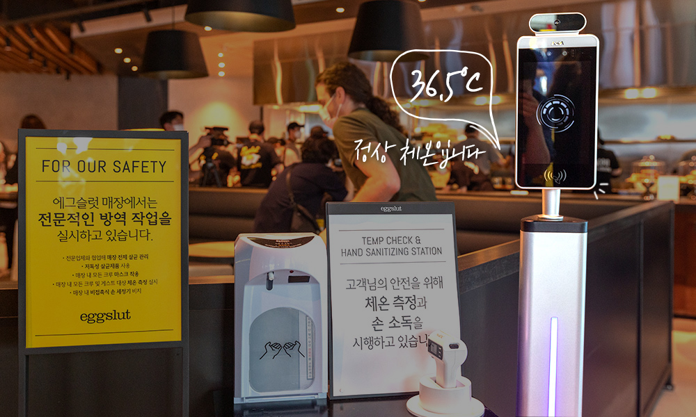 에그슬럿은 파인다이닝 출신 셰프가 개발한 달걀 요리를 통해 한 차원 높은 미식 세계를 구축한 브랜드로, 현재 삼성역 코엑스에 한국 1호점을 오픈했는데요. SPC그룹은 에그슬럿 1호점 오픈일부터 매장을 방문하는 모든 고객은 ‘비대면 안면인식 발열체크기’로 정상 체온 여부와 마스크 착용 여부를 거친 뒤 입장이 가능합니다.