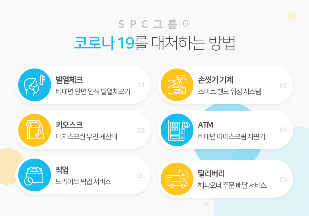 SPC그룹은 사회적 거리두기에 적극 동참하고 코로나19 확산 방지를 위해 다양한 방역 시스템을 도입하고 있습니다. 먼저 매장에 방문하는 고객들의 체온과 마스크 착용 여부를 체크할 수 있는 비대면 안면 인식 발열 체크기를 출입문에 배치하고 있습니다. 또, 매장 내 방역 강화를 위해 스마트 핸드 워싱 시스템을 도입하고 키오스크, ATM, 드라이브 픽업 서비스를 제공해 점원과 고객의 대면 접촉까지 최소화하고 있습니다. 이 외에도 매장 방문 없이도 SPC그룹의 다양한 메뉴를 맛볼 수 있도록 해피오더 주문 배달 서비스를 더욱 강화하고 있는데요. 자세한 내용을 지금 소개합니다.