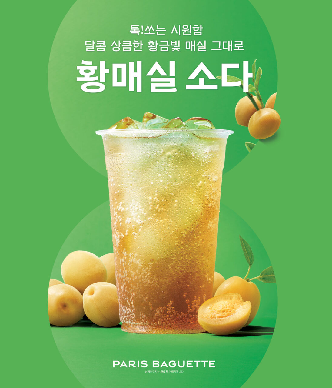 초록매실이 익은 단계인 대표적인 여름 제철 과일인 황매실! 잘 익은 황매실청에 탄산수를 더해 상큼 달콤한 맛으로 완성했습니다.