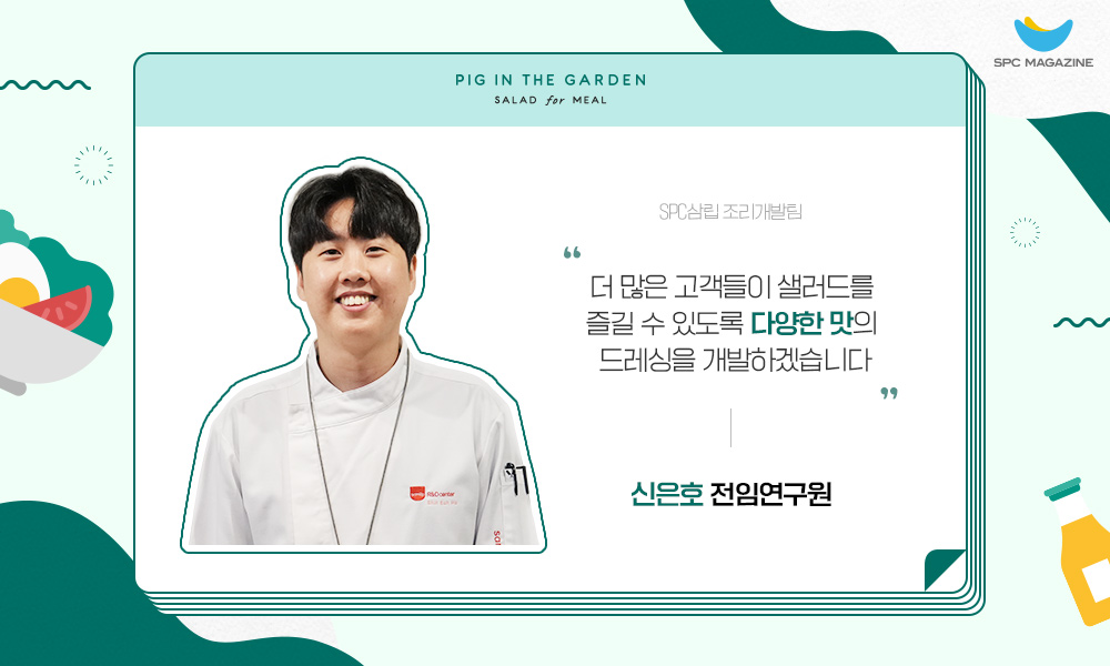 안녕하세요. 현재 SPC삼립 조리개발팀에서 피그인더가든 샐러드와 드레싱 개발을 담당하고 있는 신은호 전임연구원입니다.