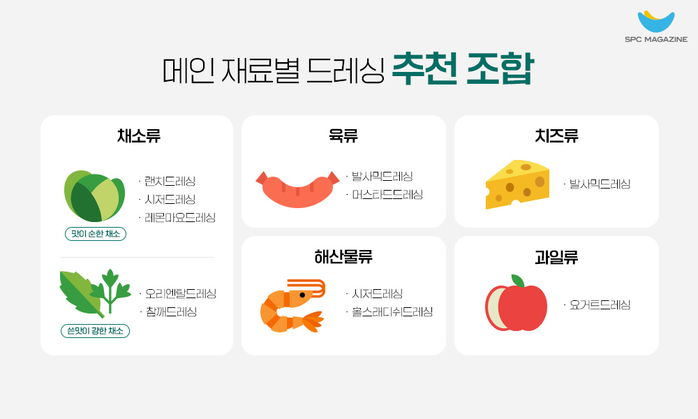 Q. 샐러드의 메인 재료(육류, 생선류, 치즈류, 과일류 등)에 따라 추천하는 드레싱은 무엇인가요?