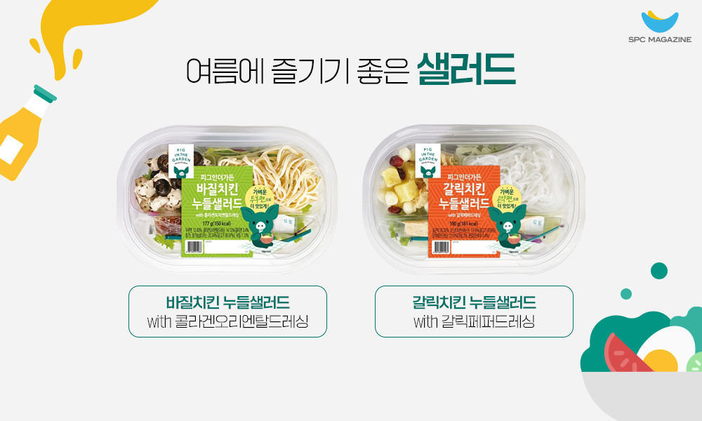 최근 저희팀 연구원들이 출시한 피그인더가든 샐러드 2종을 추천합니다. 바질치킨 누들샐러드와 갈릭치킨 누들샐러드는 샐러드 토핑으로 가장 인기 있는 닭가슴살 토핑이 공통으로 사용되었고, 각각 두부면과 곤약면이 사용되어 부담 없이 즐길 수 있는 것이 특징입니다.