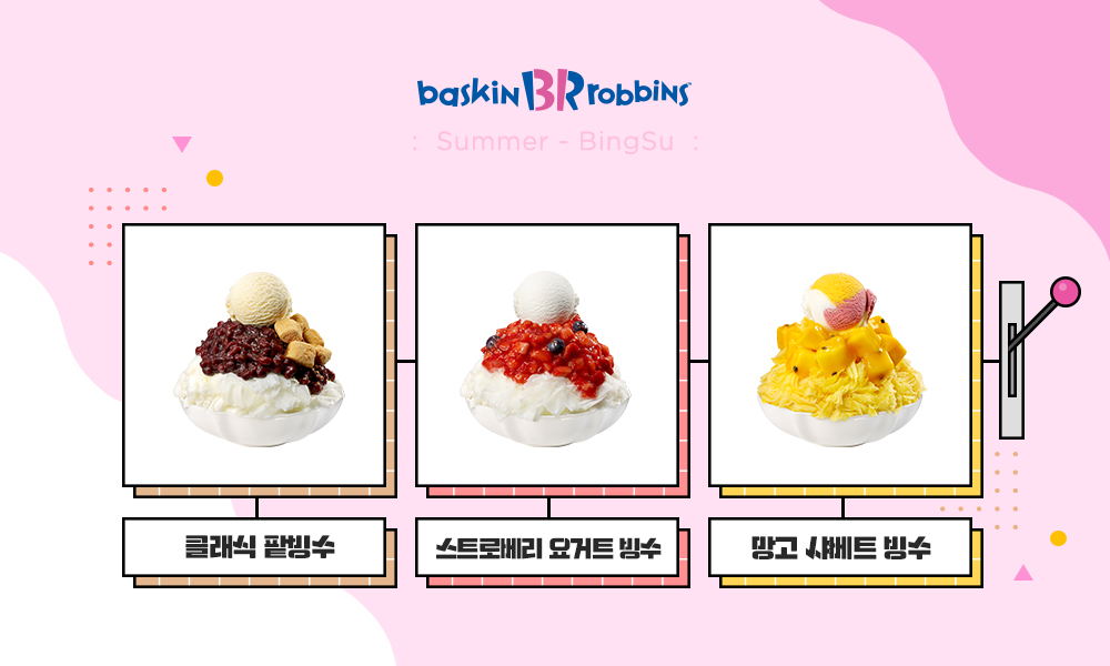 이뿐만 아니라 상큼한 과일의 맛을 느낄 수 있는 빙수도 준비되었는데요. 우유 얼음 위에 배스킨라빈스의 요거트 아이스크림을 올리고 싱싱한 딸기 토핑을 얹은 ‘스트로베리 요거트 빙수’는 무더위에 사라진 입맛을 살려줍니다. 또한, 망고 샤베트 얼음 위에 배스킨라빈스 레인보우 샤베트 아이스크림과 오동통한 망고 과육을 얹은 ‘망고 샤베트 빙수’는 새콤달콤한 맛의 조화로 완벽한 맛을 구현합니다.
