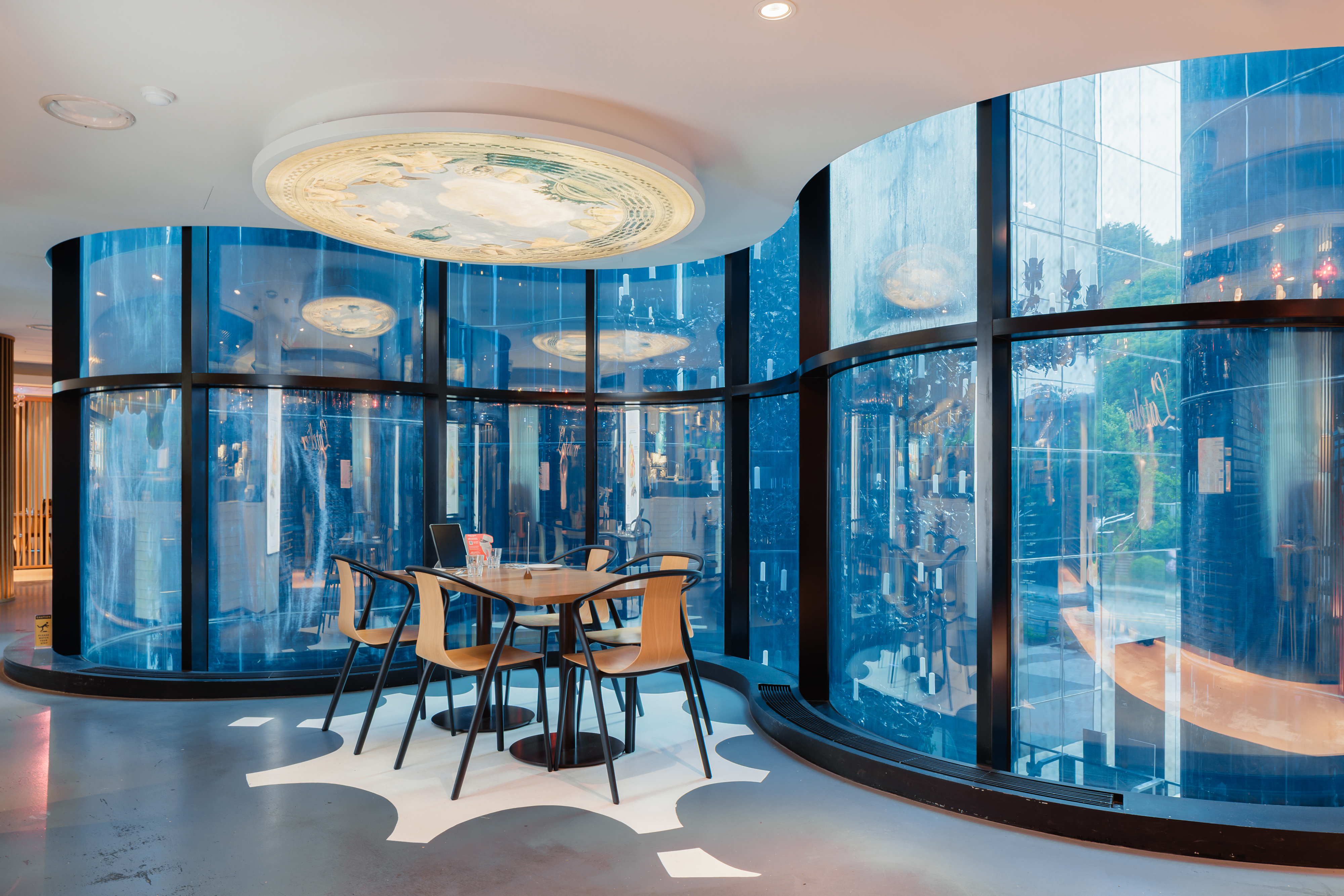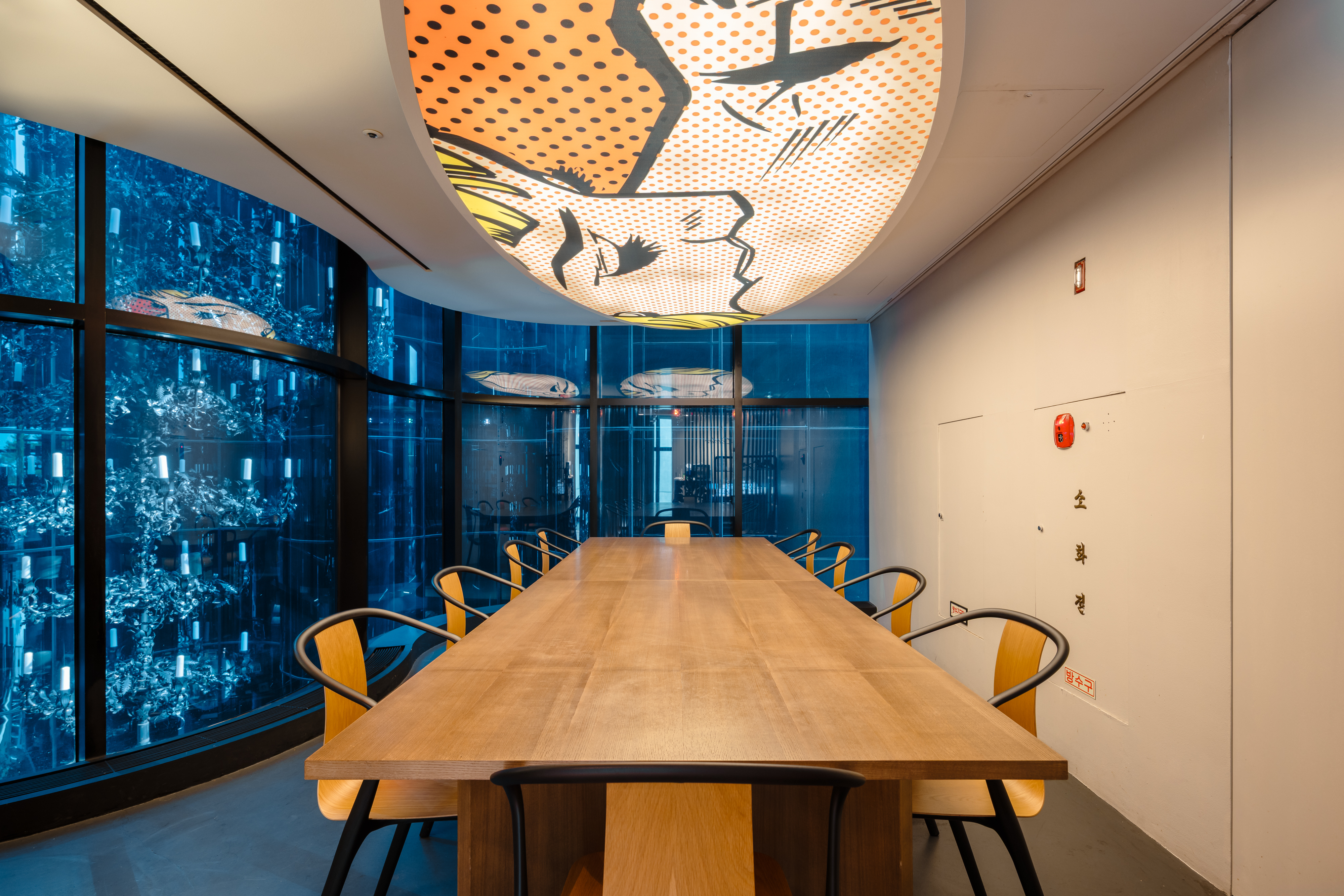 건물 안으로 들어서면, 또 하나의 인상적인 오브제가 공간을 채우고 있습니다. 이탈리아 조명 디자이너 브루노 베르나르디(Bruno Bernardi)가 기획한, 세상에 단 하나뿐인 샹들리에인데요. 수십 개의 유리 조각을 통과한 빛이 공간 전체를 수놓으며, 고요하고 섬세한 분위기를 자아냅니다.