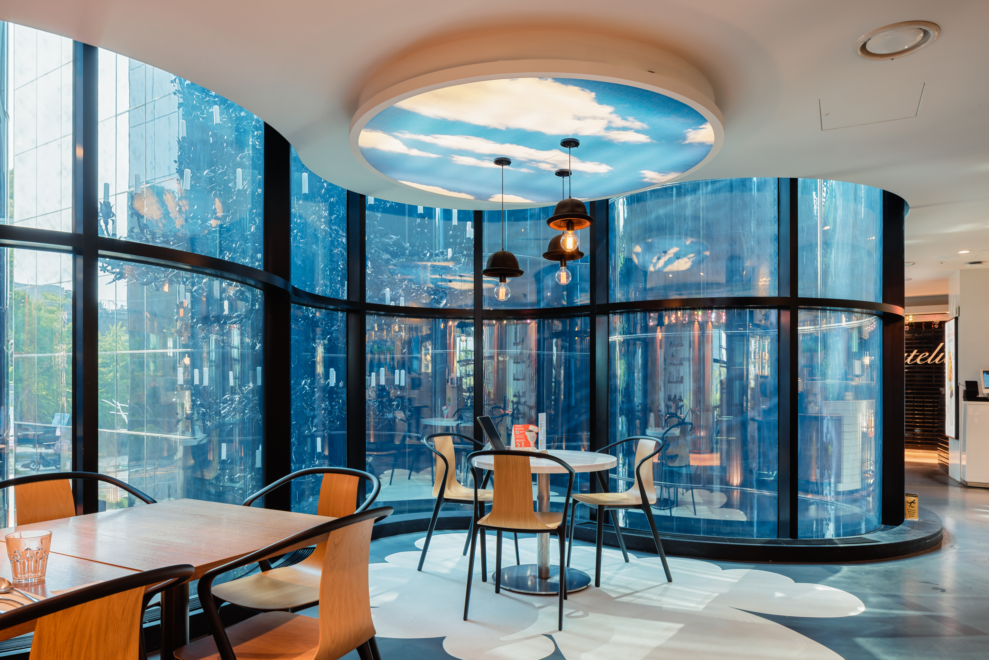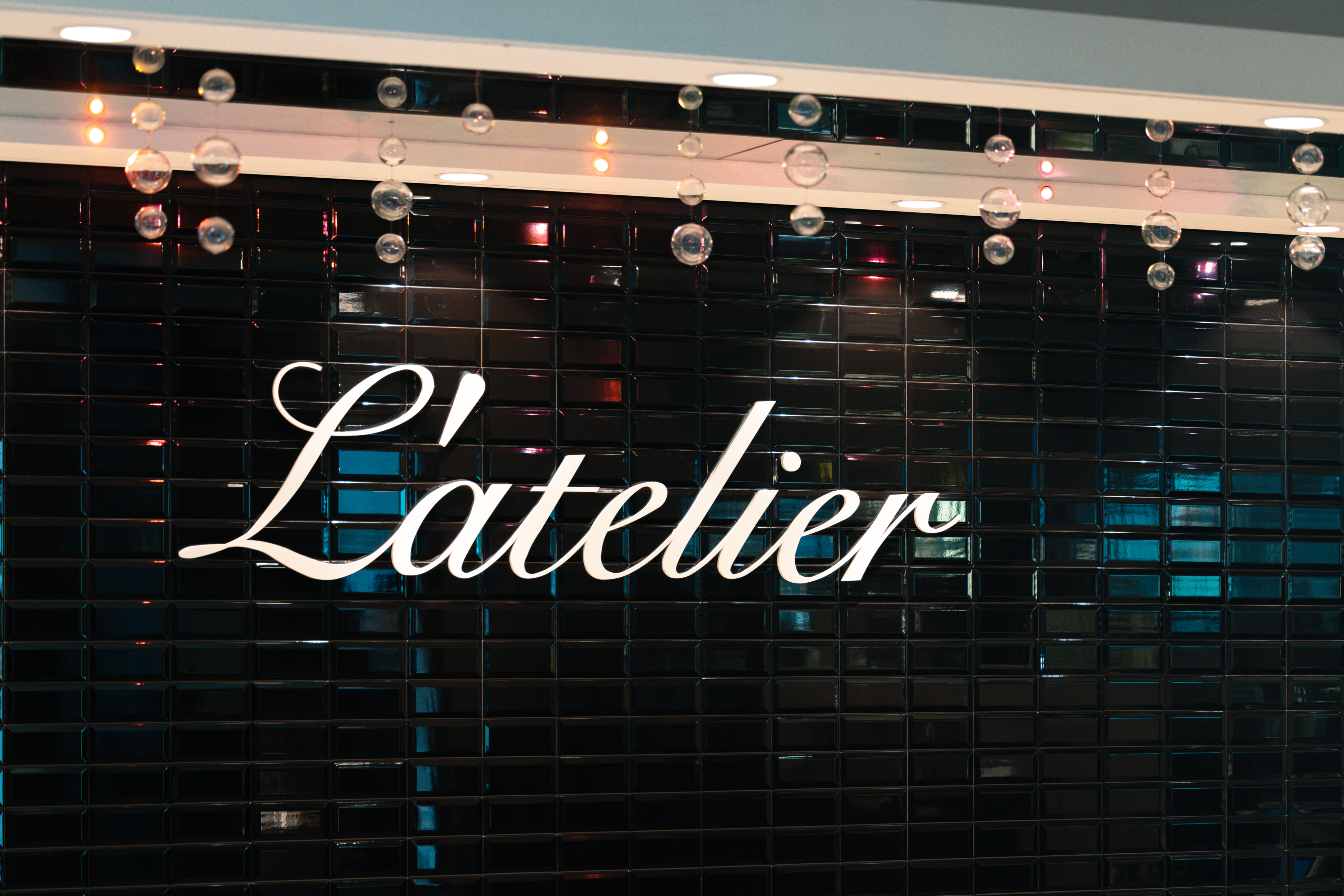 천장에 설치된 아트워크가 감성적인 분위기를 더하는 라뜰리에 한남점의 내부 전경 사진