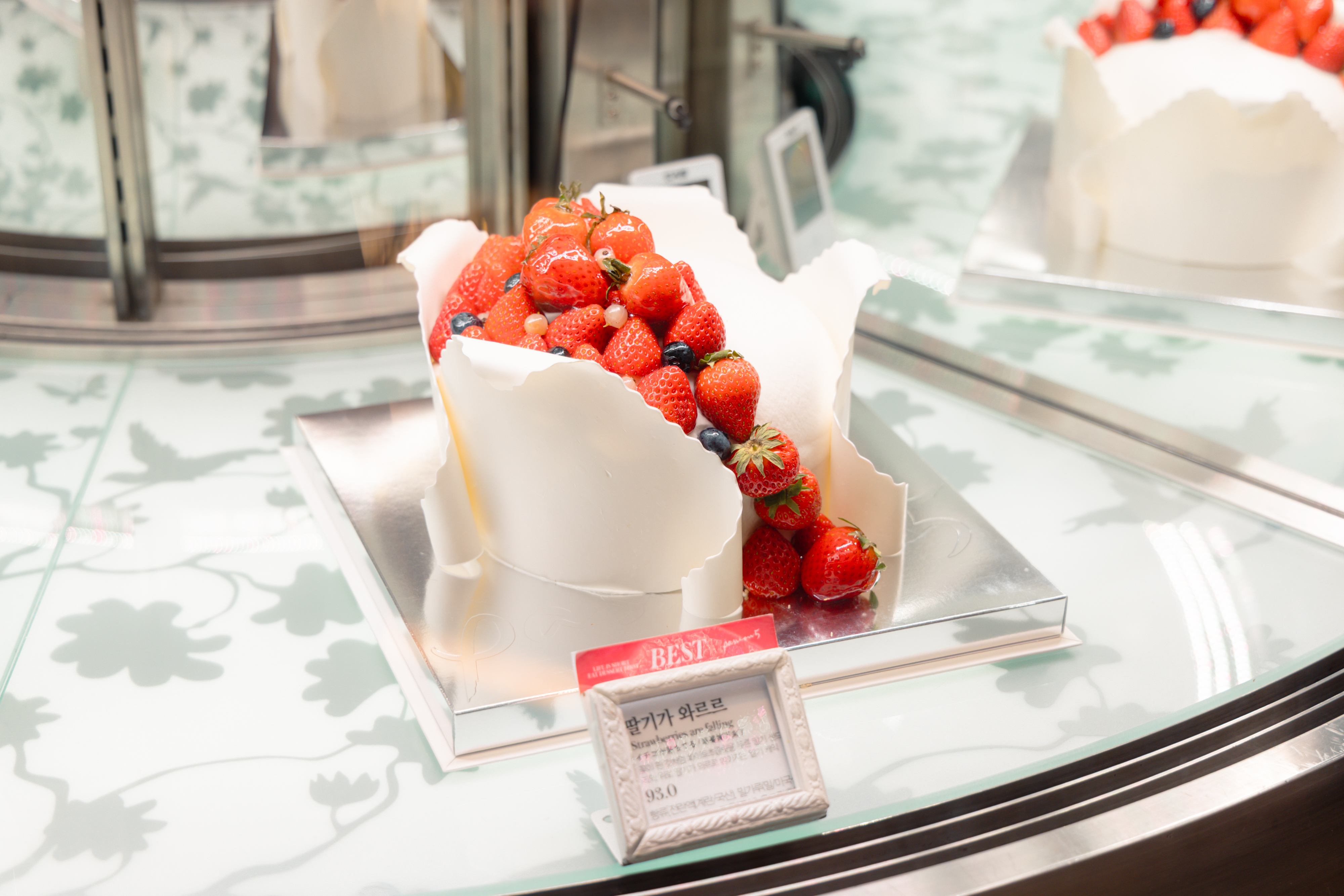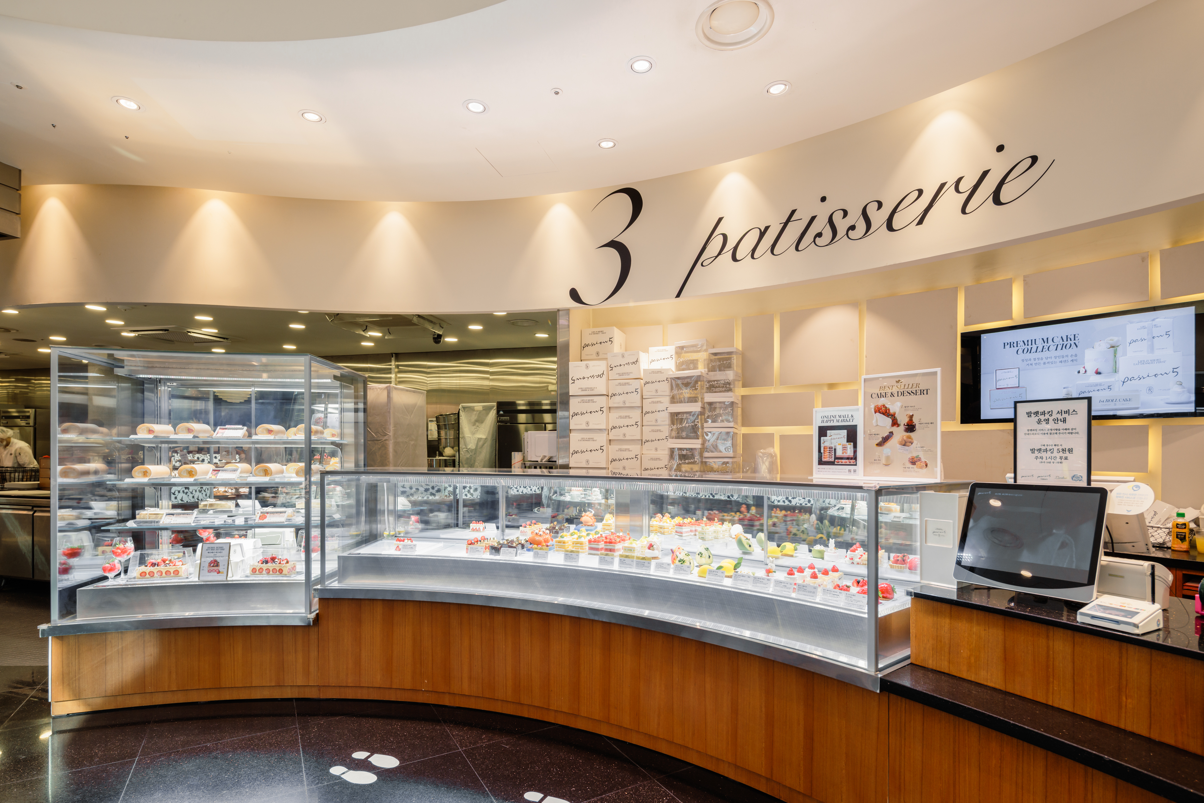 매장 중앙에는 패션5의 상징인 화려한 케이크 쇼케이스가 펼쳐져 있고, 푸딩, 모찌, 에클레어 등 SPC의 기술력이 담긴 디저트 라인업이 눈을 사로잡습니다.